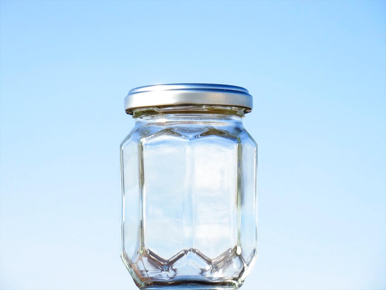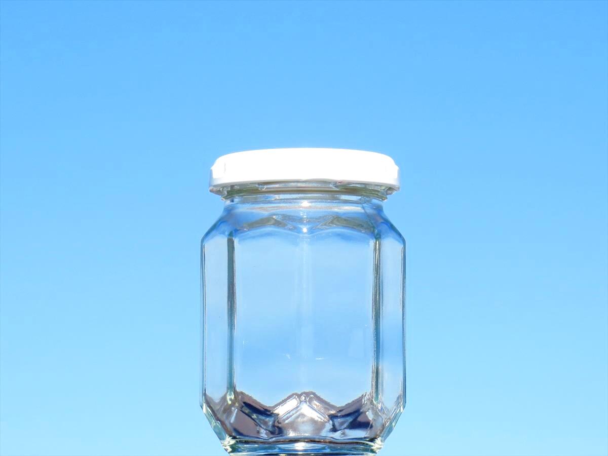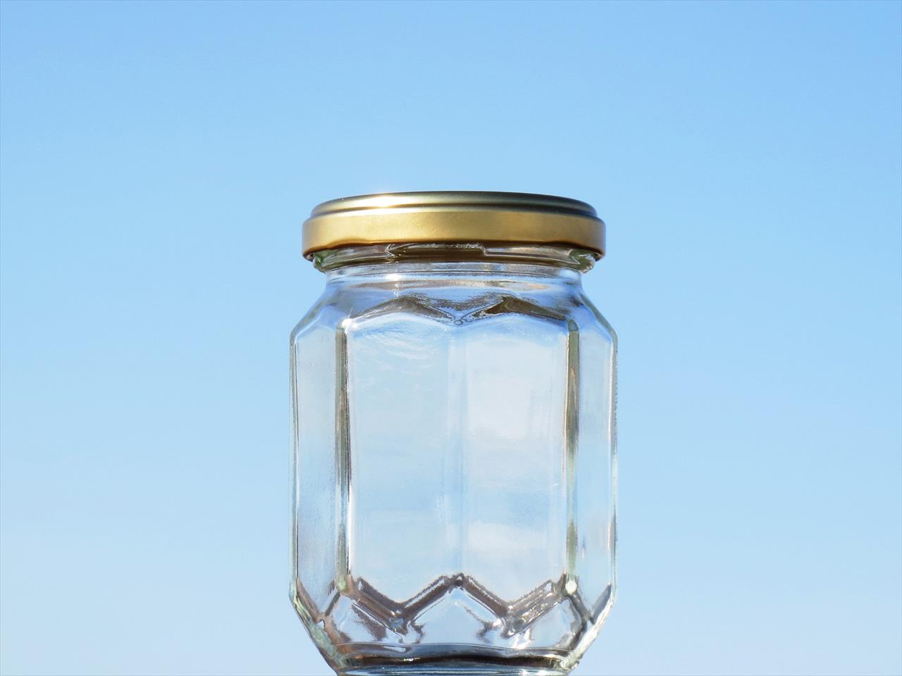 胴周だけではなく上下にも角のデザインが入る、立体感豊かな見た目にも新しい新型のジャム瓶です。