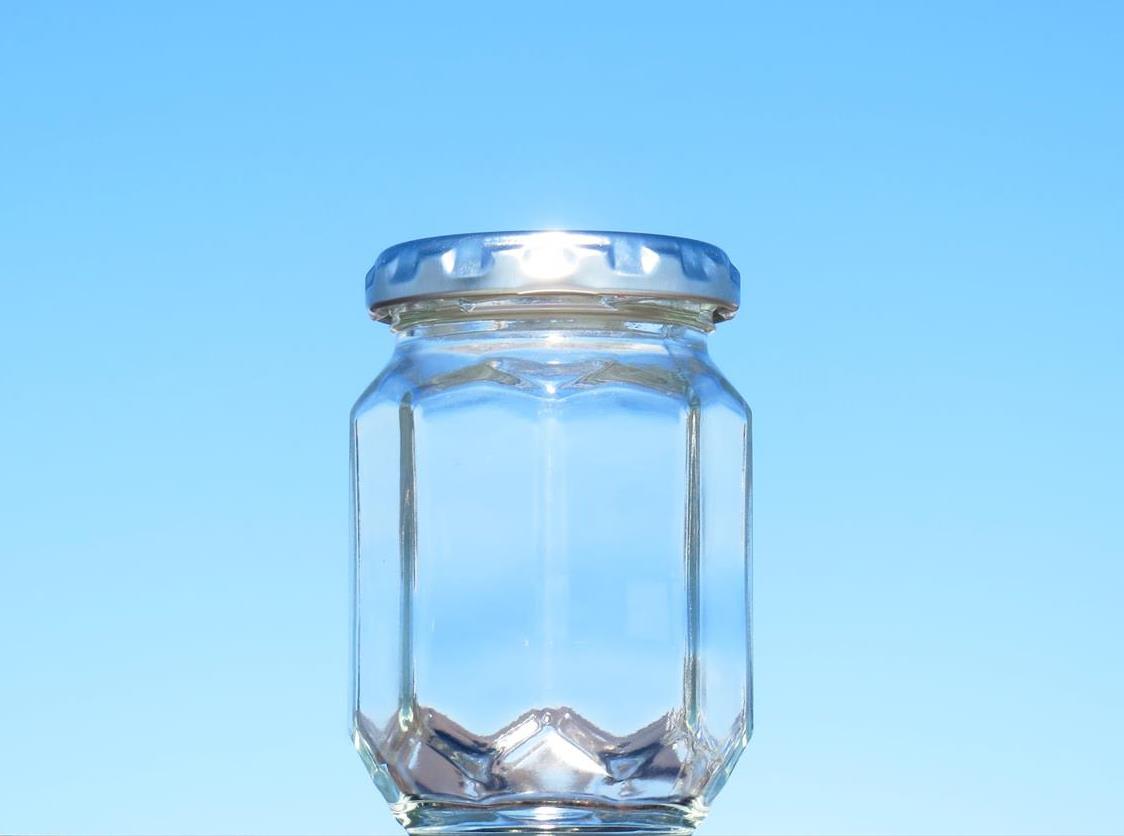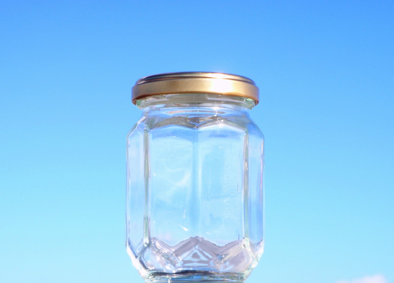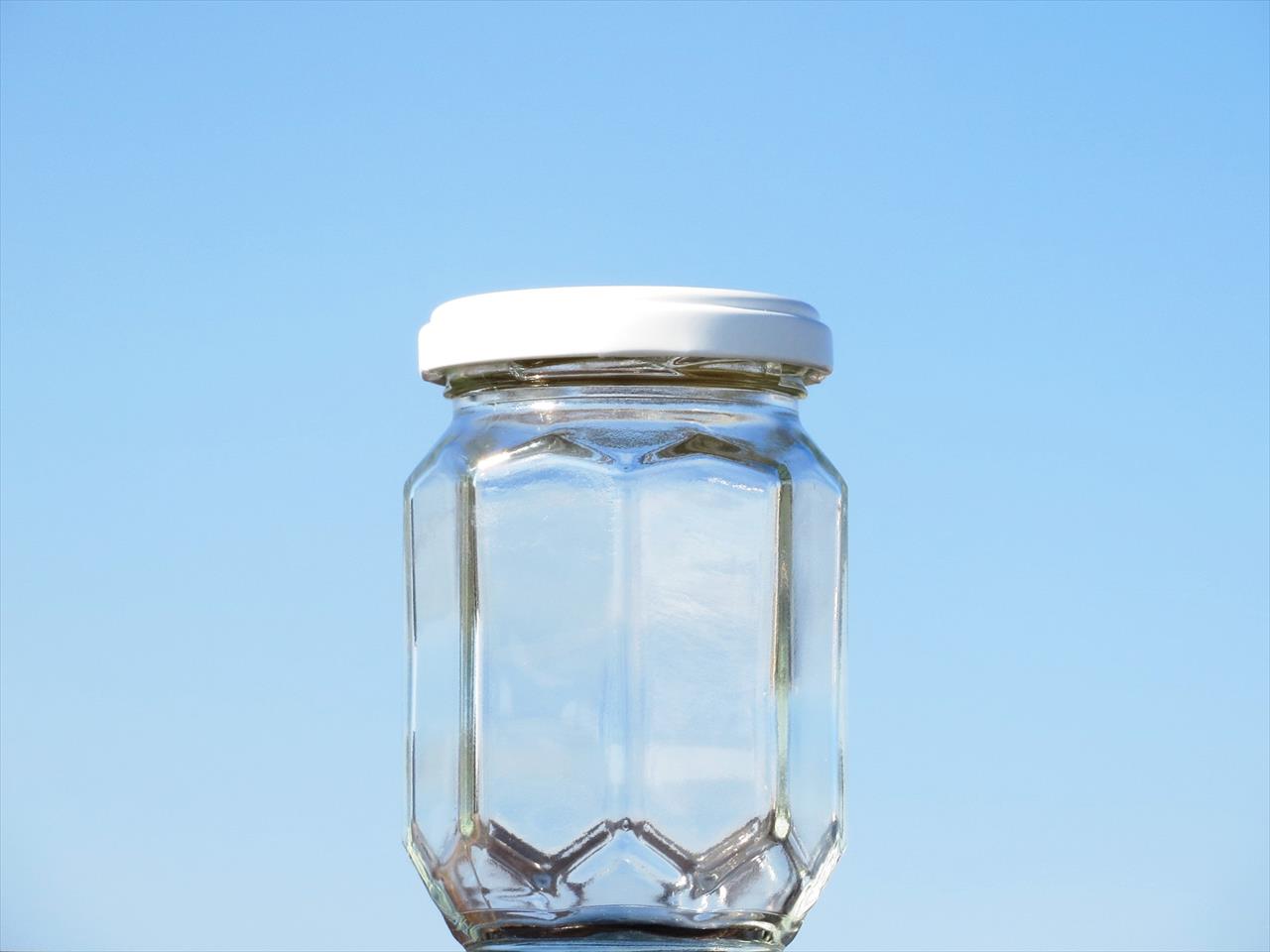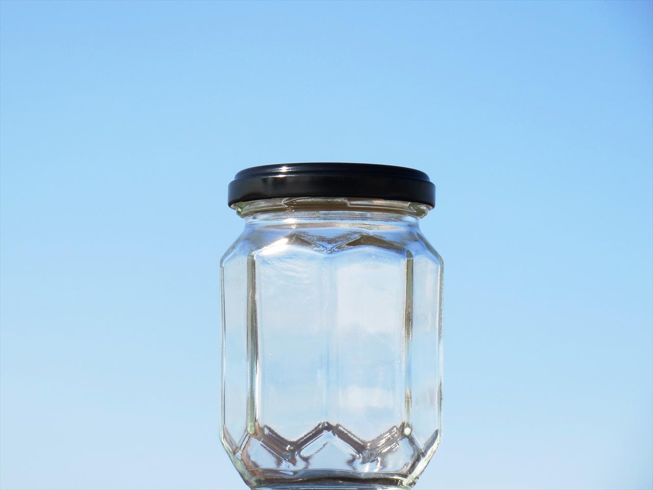 胴周だけではなく上下にも角のデザインが入る、立体感豊かな見た目にも新しい新型のジャム瓶です。