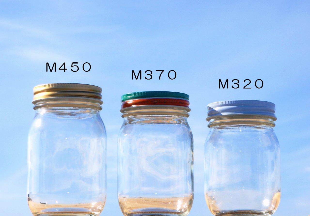 ポピュラーなサイズのM450(いわゆるマヨネーズ450・食料450)よりも1回り小ぶりなマヨネーズびんタイプの保存瓶です。